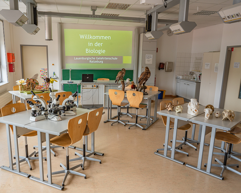 Mindestens genauso wichtig wie die Umgebung der Schule sind die Unterrichtsräume. Die LG verfügt über drei gleichwertig ausgestattete Biologie-Fachräume, in denen der komplette Biologieunterricht stattfindet. Jeder Fachraum wird als Kabinett von zwei bis drei Kollegen gemeinsam genutzt und ist individuell gestaltet. Alle drei Räume verfügen über ein Mediensystem mit Notebook incl. digitalem Unterrichtsassistent, Beamer, Soundsystem und Dokumentenkamera und seit neuem interaktiven Tafeln. Über Medienlifte kann jeder Schülerarbeitsplatz mit Strom und Gas für Schülerexperimente versorgt werden. Zudem stehen neben Laborgeräten auch Schülermikroskope und Stereolupen in Klassensatzstärke in jedem Raum zur Verfügung. Zusätzlich zu den Unterrichtsräumen gibt es noch ein Biologie-Schülerlabor, in dem einzelne Schüler oder kleine Schülergruppen selbstständig experimentieren können.
