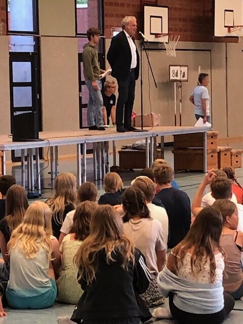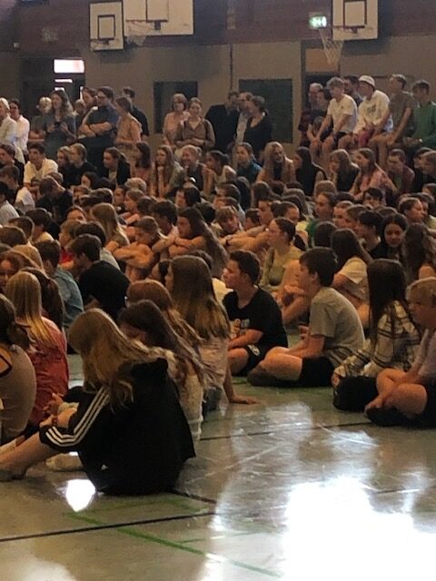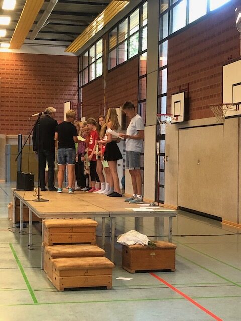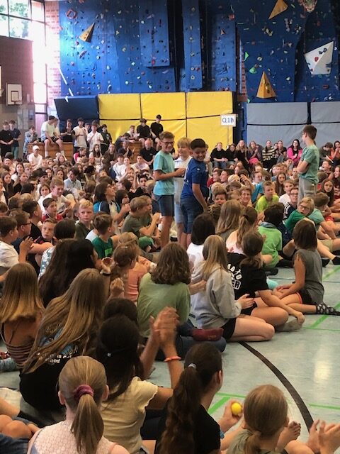 Am letzten Schultag vor den Sommerferien fand – wie auch in früheren Jahren – eine Ehrungsveranstaltung statt, zu der sich alle Schülerinnen und Schüler mit ihren Lehrkräften in der großen Sporthalle der LG sammelten. Wer sich in diesem Schuljahr in besonderer Weise sozial engagiert hat, sportlich besonders erfolgreich gewesen ist oder herausragende schulische Leistungen gezeigt hat, wurde im Laufe der Veranstaltung auf die Bühne gerufen und erhielt neben einer Dankesurkunde der LG viel Beifall von der Schulgemeinschaft.