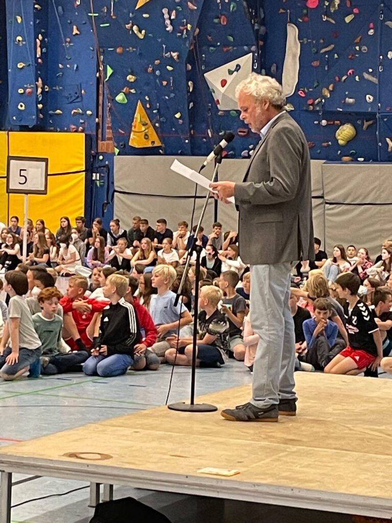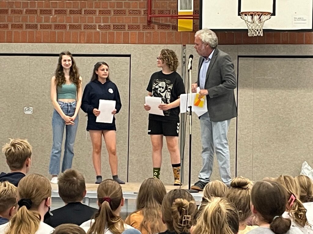 Kurz vor Ausgabe der Zeugnisse trafen sich noch einmal alle in der Sporthalle der LG, um all die Schülerinnen und Schüler gemeinsam zu ehren, die sich in diesem Schuljahr in besonderem Maße für unsere Schule eingesetzt hatten. Dabei machte die Schulsprecherin Angelina Schlecht zunächst deutlich,wie wichtig für alle ein gemeinsames, aktives Schullleben angesichts der großen aktuellen Verunsicherungen durch die Corona-Epidemie und den Krieg in der Ukraine ist. Unter großem Beifall wurden anschließend zahlreiche Schülerinnen und Schüler für ihr kulturelles oder soziales Engagement, ihre sportlichen Erfolge in verschiedenen regionalen und landesweiten Wettbewerben oder ihre herausragenden schulischen Leistungen geehrt!