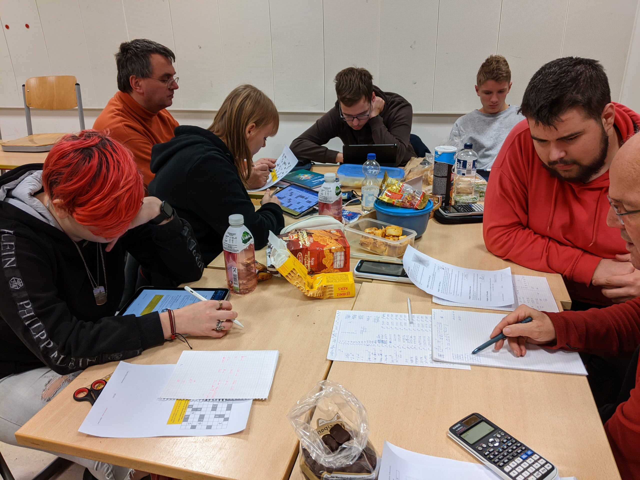 Bei allen anderen rauchten die Köpfe noch weiter bis Mitternacht. In der Jahrgangsstufe 8/9 war um 22:00 fast alles gelöst. Nur ein besonders schwieriges Sudoku-artiges Rätsel fehlte noch. Und so saßen mehrere Schülerinnen und Schüler und Lehrerinnen und Lehrer gemeinsam fast 2 Stunden lang an diesem einen letzten schwierigen Teil der ersten Runde, bis er um kurz nach Mitternacht nach mehreren Irrwegen, Fehlversuchen und zahlreichen “Das kann doch nicht sein!”-Seufzern endlich geknackt war. Leider blieb es trotzdem bis zum Schluss bei 9 von 10 gelösten Aufgaben, da wir in einer anderen Teilaufgabe noch einen Fehler hatten.