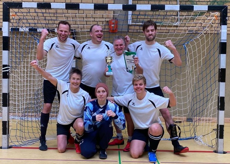 Der Jubel über den Siegerpokal war nach acht kräftezehrenden Partien groß (v.li.): Flemming Zunker, Martin Kosbab-Zillmann, Frank Benson, Marcus Sitte (hinten), Anke Welbers, Kristina Riemenschneider und Larissa Schmidt sicherten sich den erstmals ausgespielten Hallentitel.
