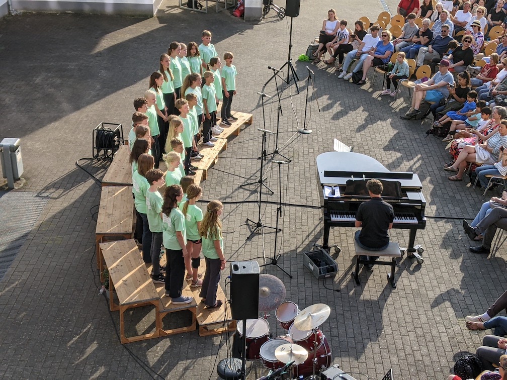 Den Beginn machte die Chorklasse 5 mit zwei ruhigen Stücken, bevor die Chorklasse 6 mit „Major Tom“ und ihrem „Rolltreppenmax“ für beste Stimmung sorgte. Der Mittelstufenchor überzeugte mit drei Titeln aus dem Film „The greatest Showman“ und wurde dabei von einer Band aus Schülern und Lehrern begleitet. Abschließend sang das Schulchor Teile aus seinem Programm „Let there be peace“, was er bereits am 9. Mai im Dom aufgeführt hatte. Dass dann pünktlich zu „Blowing in the wind“ zwei Heißluftballons direkt über die Köpfe von Chören und Publikum hinwegzogen, die anscheinend von allen unbemerkt auf dem Bolzplatz der Schule gestartet waren, wird wohl allen Beteiligten in Erinnerung bleiben.